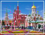 Rusia, Moscú - El Kremlin y la Plaza Roja. Capital de la Federación Rusa, Moscú es una ciudad de impresionante arquitectura. La Plaza Roja y el Kremlin, corazón de la ciudad antigua, conforman un conjunto arquitectónico insuperable, con la Catedral de San Basilio, el Museo de Historia Rusa, los Almacenes GUM, y las murallas que guardan las cuatro Catedrales, al interior del recinto amurallado. En medio de la plaza, el Mausoleo del líder soviético Lenin, en mármol rojo y negro, resalta como construcción moderna.