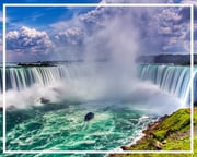Niagara Falls - En la frontera entre Estados Unidos y Canadá, el imponente espectáculo natural de las caídas del río Niagara tiene dos lados, las Cataratas de Ontario, del lado canadiense, con más infraestructura turística, y las cataratas de New York, del lado americano, y entre ellas, la Gran Cascada, de impresionante belleza e inconmensurable fuerza natural. En Clifton Hill esta la Rueda del Cielo del Niagara, con vistas del río, las pocetas de agua caída y las cascadas.